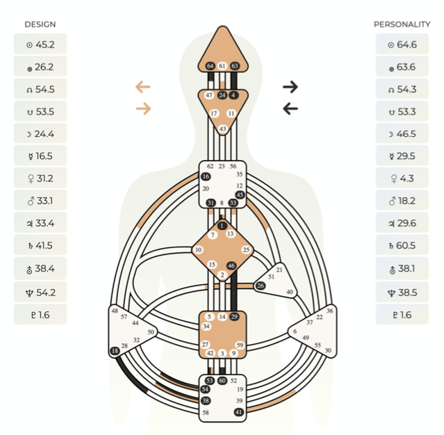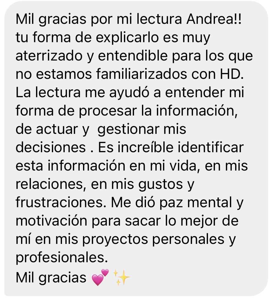 Esto es un GRAN RESUMEN y muy a grosso modo lo que vemos en la sesión, cada lectura es ÚNICA & DIFERENTE, ya que Diseño Humano es precisamente eso, LA CIENCIA DE LA DIFERENCIACIÓN, por lo tanto, dependerá muchísimo de la interacción, del feedback en el momento de la lectura y de la etapa de vida o situación que esté viviendo el cliente a la hora de tomar su sesión.